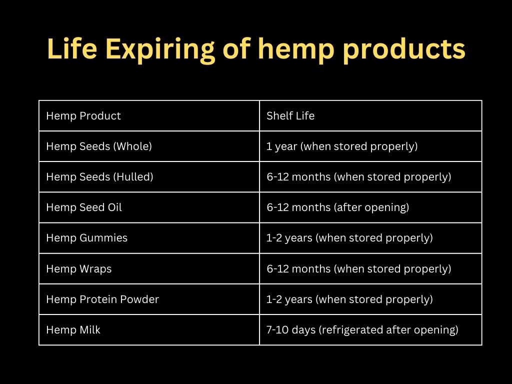 Certainly! Here’s a table outlining the approximate shelf life of various hemp products: