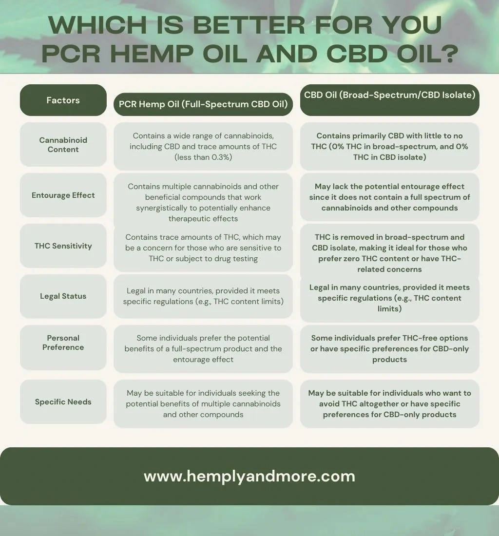 Certainly! Here’s a table highlighting the key differences between PCR hemp oil and CBD oil: CBD oil can refer to both full-spectrum CBD oil, which contains multiple cannabinoids including CBD and THC (within legal limits), as well as broad-spectrum CBD oil, which is similar but with THC removed.