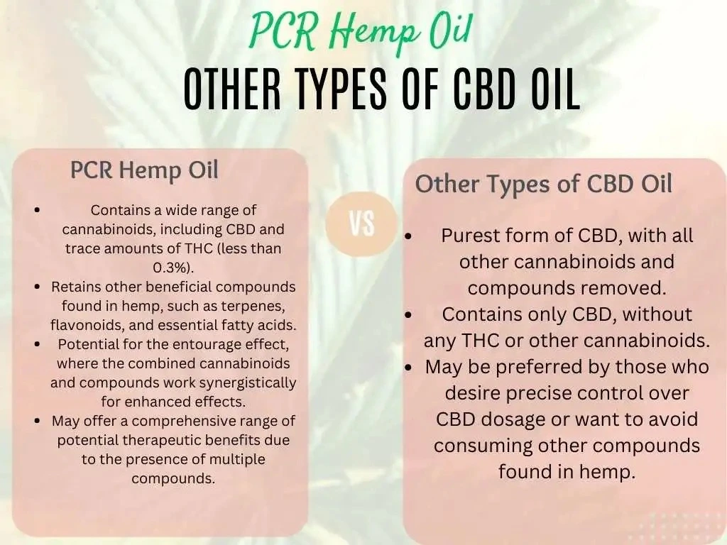 PCR hemp oil differs from other types of CBD oil, such as CBD isolate or broad-spectrum CBD oil, in that it contains a wider range of phytocannabinoids and compounds.