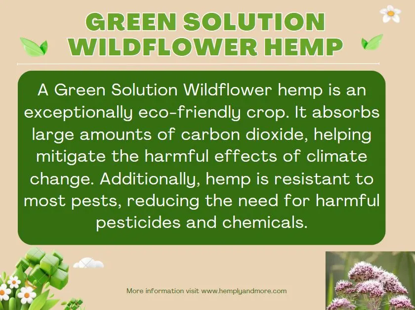 A Green Solution Wildflower hemp is an exceptionally eco-friendly crop. It absorbs large amounts of carbon dioxide, helping mitigate the harmful effects of climate change. Additionally, hemp is resistant to most pests, reducing the need for harmful pesticides and chemicals.